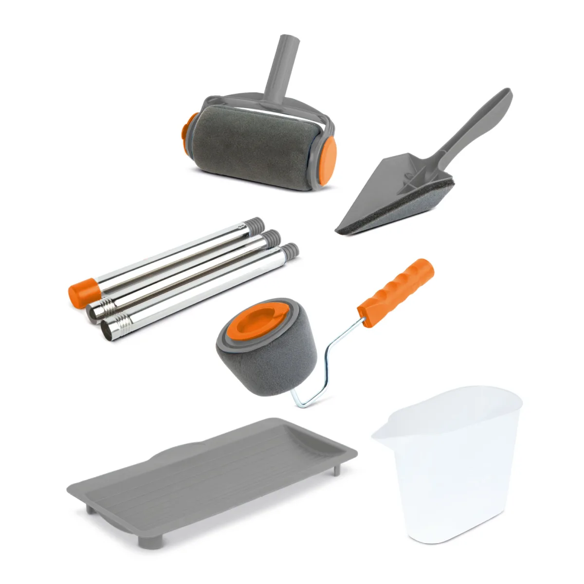 Posoda za ponovno polnjenje Ni treba uporabljati vedra za barvo 6-delni komplet za slikanje Pleskanje brez madežev in lis je enostavno Enostavno čiščenje pod pipo Komplet vsebuje: Valjček za pleskanje Ozek valjček za pleskanje Orodje za kotno pleskanje Palica Merilna skodelica Ročaj za barvanje